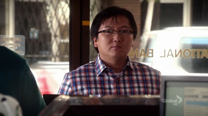 Max is patiently standing in line and waits for ‘his’ teller to be free. Okay, I confess, I really like Max. I think he is a quirky and interesting character, and I’m happy that he has snatched a bigger role on Five-0. He is a bit strange, but not so much that you only shake your head and move on, but you are curious and interested in him. And I think Masi Oka is doing a great job with him. (He and Greg Grunberg were my favorites on Heroes.)