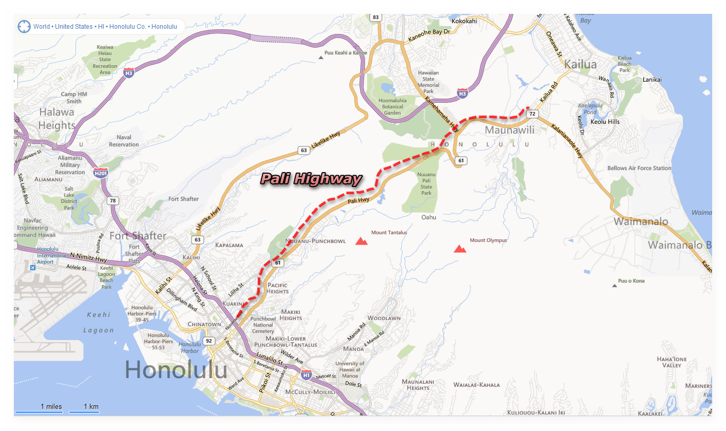 In 1845 the first road was built over the Nuʻuanu Pali to connect Windward Oʻahu with Honolulu. In 1898 this road was developed into a highway which during construction 800 skulls were found believed to be the remains of the warriors that fell to their deaths from the cliff above This road was later replaced by the Pali Highway and the Nuʻuanu Pali Tunnels in 1959 which is the route used today.