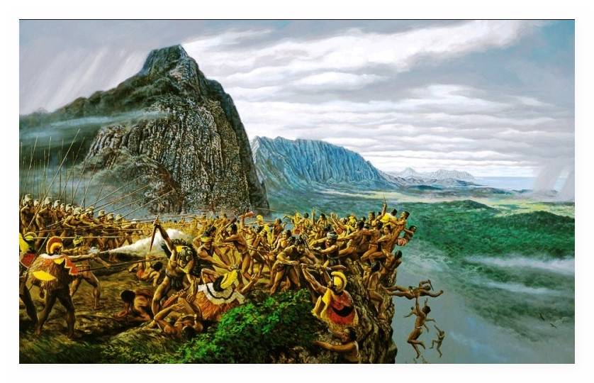 The Nuʻuanu Pali was the site of the Battle of Nuʻuanu, one of the bloodiest battles in Hawaiian history, in which Kamehameha I conquered the island of Oʻahu, bringing it under his rule. In 1795 Kamehameha I sailed from his home island of Hawaiʻi with an army of 10,000 warriors, including a handful of non-Hawaiian foreigners. After conquering the islands of Maui and Molokaʻi, he moved on to Oʻahu. The pivotal battle for the island occurred in Nuʻuanu Valley, where the defenders of Oʻahu, led by Kalanikūpule, were driven back up into the valley where they were trapped above the cliff. More than 400 of Kalanikūpule’s soldiers were driven off the edge of the cliff to their deaths 1,000 feet below.