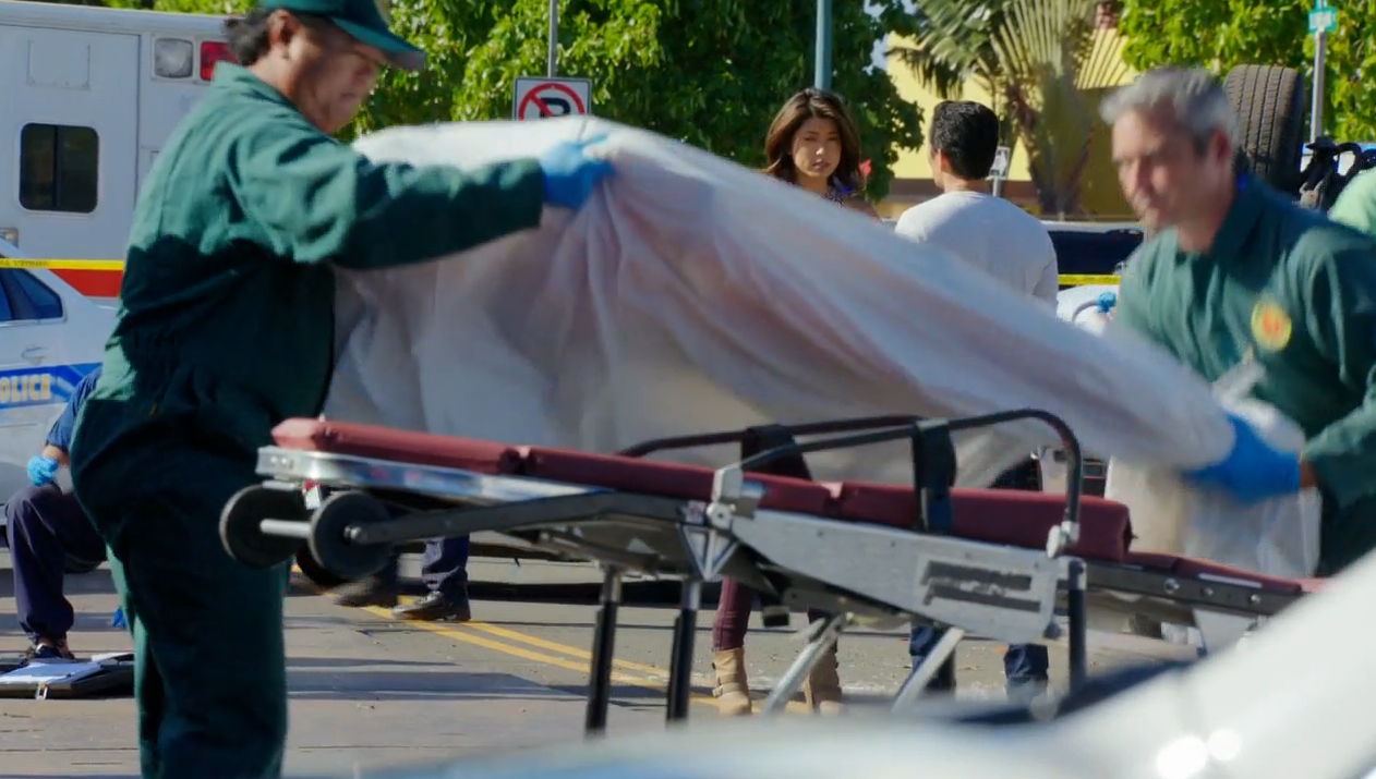 I had a really good laugh seeing these two guys lifting ‘something’ onto the gurney. That for sure was not a body. A mummified body maybe, but surely none of the shot officers or technicians. It’s like when people carry empty suitcases in scenes. That looks equally ridiculous.