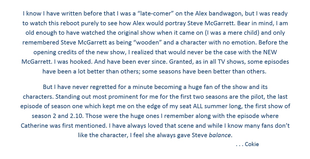 BUT, this is not about Danny, this is just about all the wonderful stuff I loved and still love about Five-0. So, Danny gets a pass for once. 😉